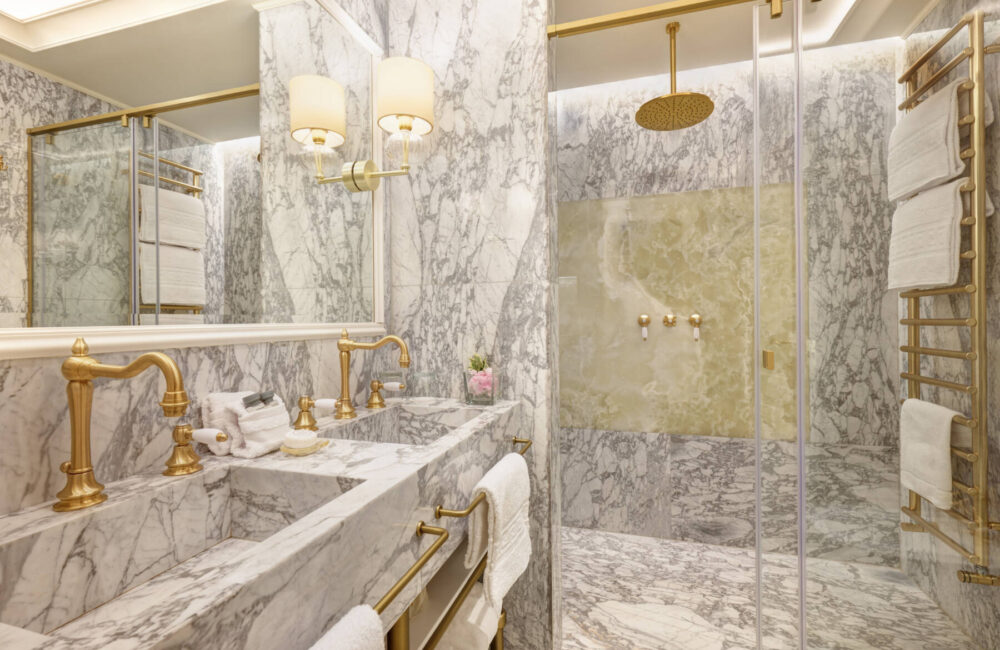 Il bagno ristrutturato con materiali preziosi italiani offre una spaziosa doccia e doppio lavabo. Linea cortesia di lusso con selezionati prodotti da bagno, accappatoi, fon, specchio ingranditore per il trucco, stira capelli e pantofole.
