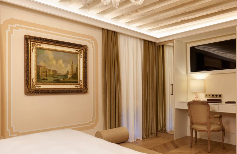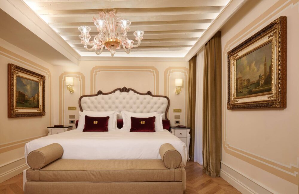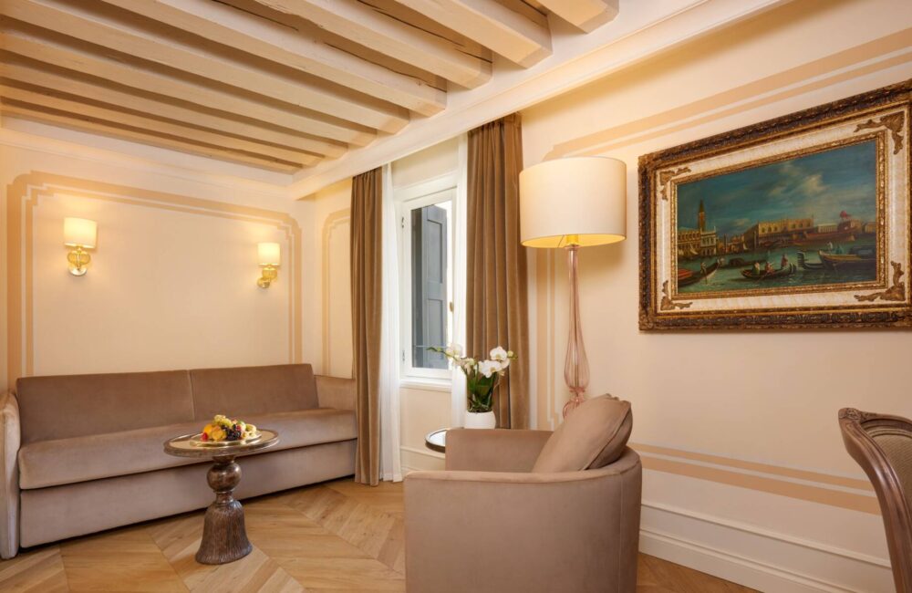 Con una dimensione ci circa 35 m², particolarmente ariosa e con salotto vista giardino interno. Caratterizzata da mobili eleganti e finiture preziose, anche con decorazioni originali del ‘500 e travi a vista d’epoca, la Suite Vista Giardino è un invito esclusivo all’agio e alla confortevolezza.